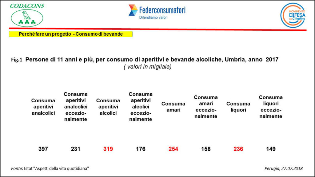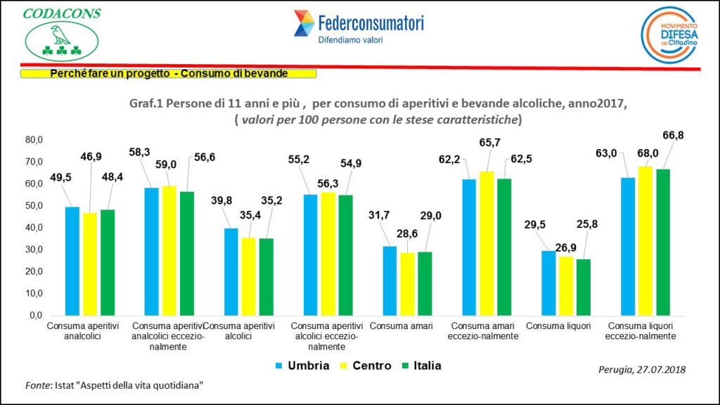 Dalla rilevazione “Aspetti della Vita Quotidiana”, annualmente condotta dall’Istat sulla popolazione costituita dalle famiglie residenti in Italia e dagli individui che le compongono, (escluse le persone che risiedono in istituti di convivenza). Assumendo come riferimento la popolazione con 11 anni e più per l’Umbria, emerge che nell’anno 2017 si stima che il 49,5% consuma aperitivi analcolici, il 39,8% aperitivi alcolici, il 31,7% amari, il 29,5 % liquori; tali valori risultano sistematicamente superiori sia a quelli stimati per il Centro sia per il livello nazionale. Di contro la quota di coloro che consumano bevande alcoliche con modalità “eccezionalmente” in Umbria risulta minore rispetto a quella stimata per l’area di Centro e Nazionale (Graf.1).
