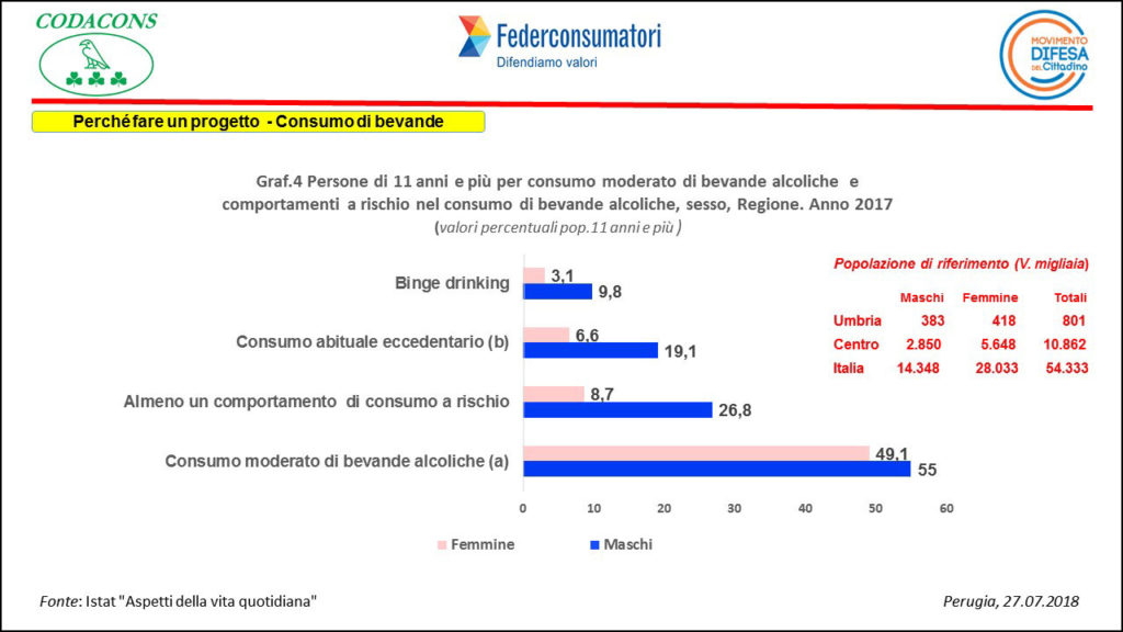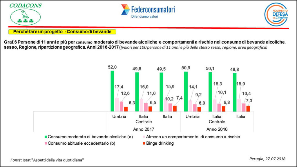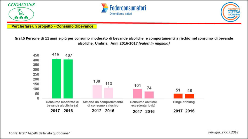 Gli stessi comportamenti messi a confronto con l’anno precedente registrano per l’Umbria circa 9 mila persone in più che consumano bevande alcoliche con moderazione, circa 26mila in più assumono un comportamento definito a rischio, di circa 27mila persone aumenta la quota che hanno un comportamento eccedentario e in 51mila persone, 3mila più dell’anno precedente, si verificano episodi di ubriacatura concentrati in singole occasioni ( binge drinking ).