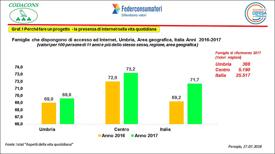 Dalla rilevazione “Aspetti della Vita Quotidiana”, annualmente condotta dall’Istat sulla popolazione costituita dalle famiglie residenti in Italia e dagli individui che le compongono, (escluse le persone che risiedono in istituti di convivenza) per la regione Umbria emerge, nel 2017, che le famiglie che dispongono di un collegamento in internet sono stimate in 270 mila e rappresentano il 69,6 % della popolazione, valore inferiore di circa 4 punti percentuali rispetto all’area del Centro e circa 2 punti dal valore nazionale (fig. 1).