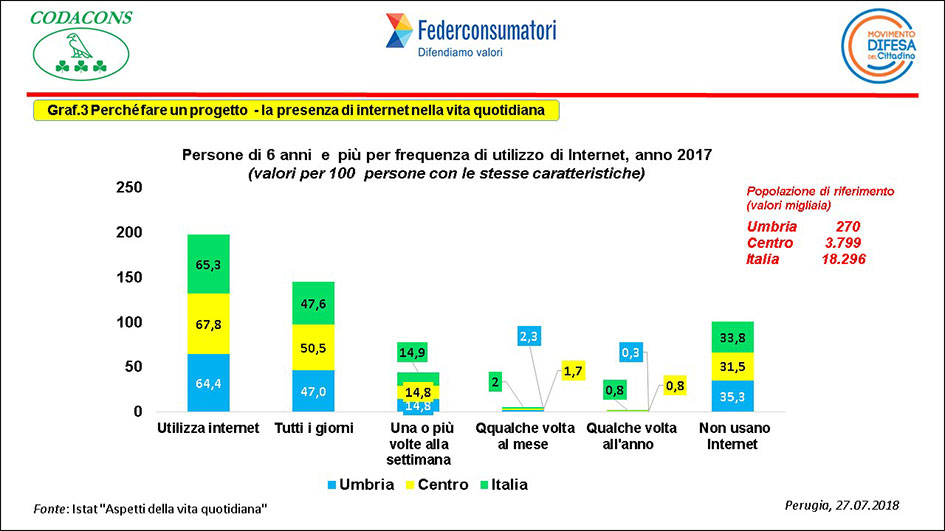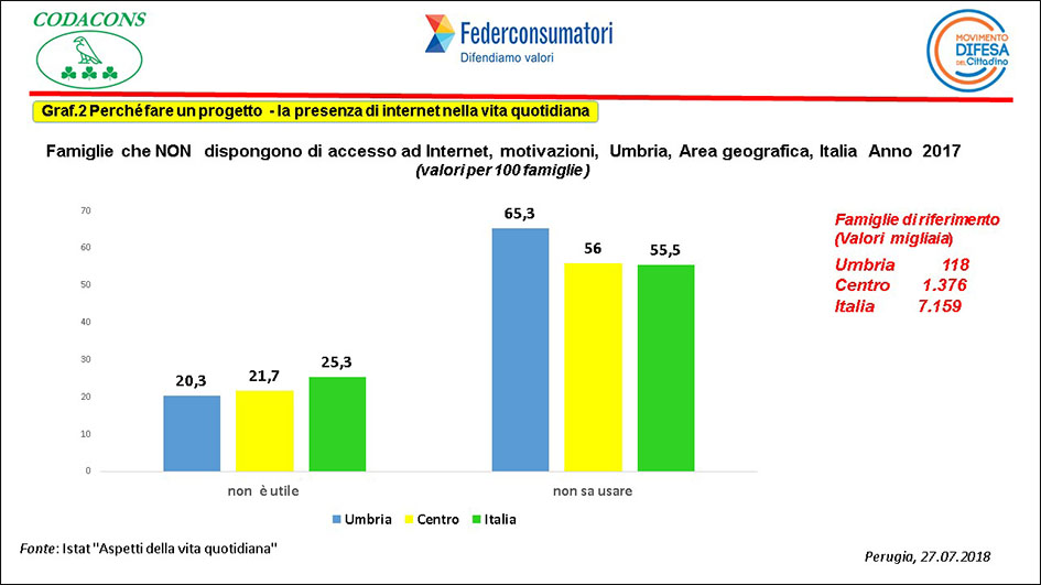 Da ciò ne deriva che le famiglie che non dispongono di un collegamento ad internet in Umbria sono circa 118 mila, e di queste il 20,3% adduce il motivo della non utilità e 65,3 % l’assenza di competenza nell’utilizzo (Graf. 2).